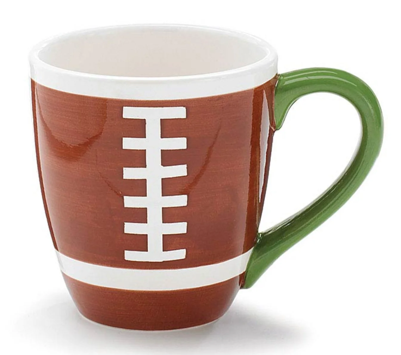 Hand-painted ceramic football mug with brown and white stitching on the front to resemble a football. Interior is white and handle is green. Individually boxed.