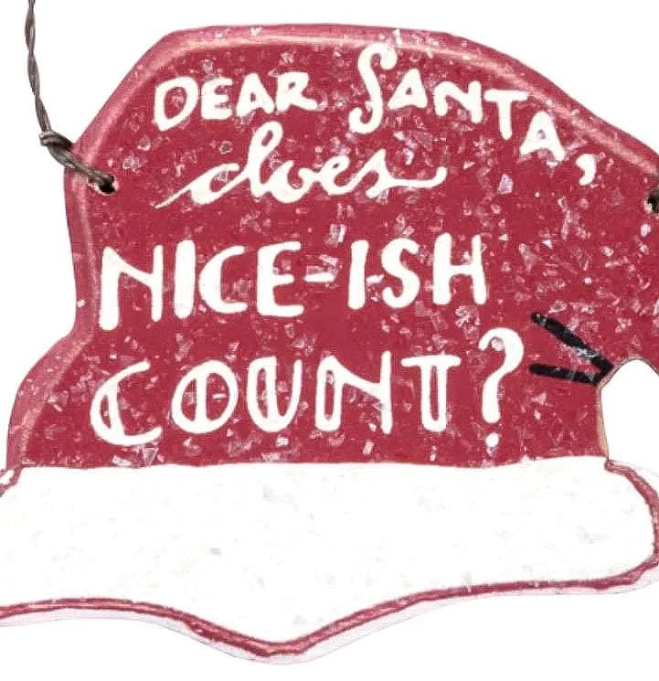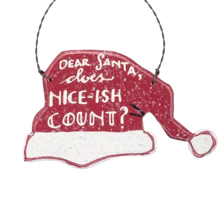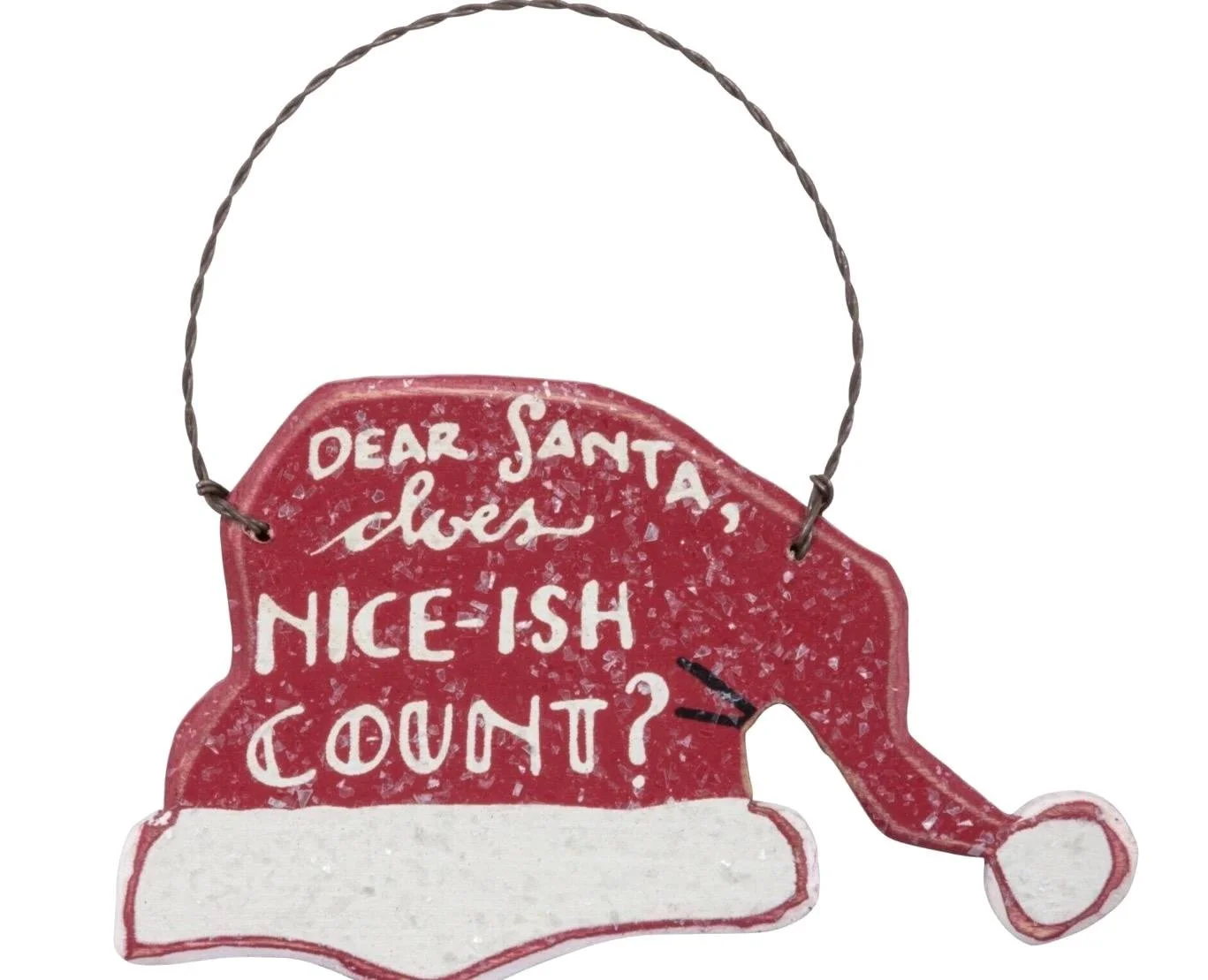 A rustic slat wood Christmas ornament featuring a typeset "Dear Santa, Does Nice-ish Count?" sentiment and textured coating for a snowy effect. Contains a twisted top wire loop for easy hanging.