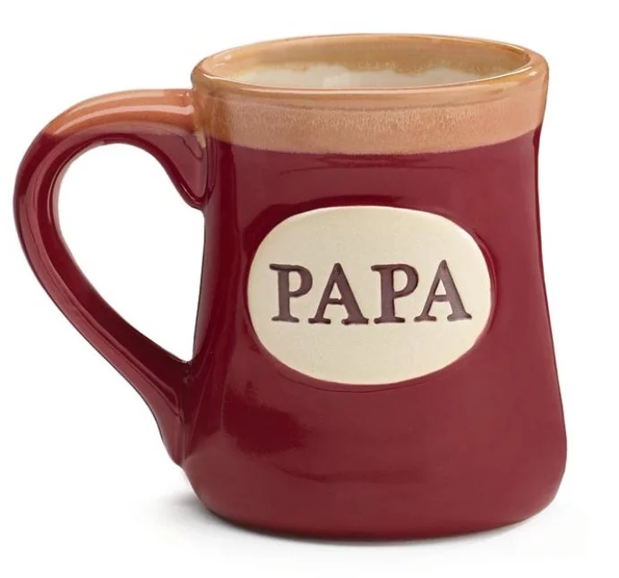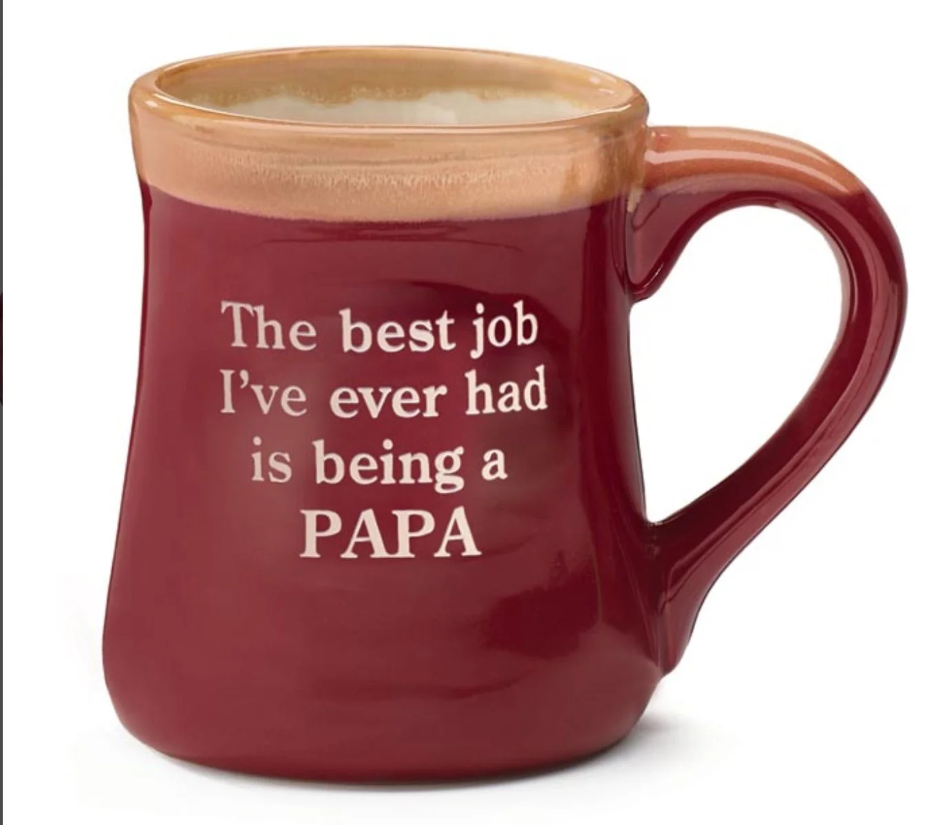 Hand-painted porcelain burgundy mug with cream trim on rim and top of handle. Front has "PAPA" inscribed on a raised oval medallion. Back has the decal message: The best job I've ever had is being a PAPA. Individually gift boxed.