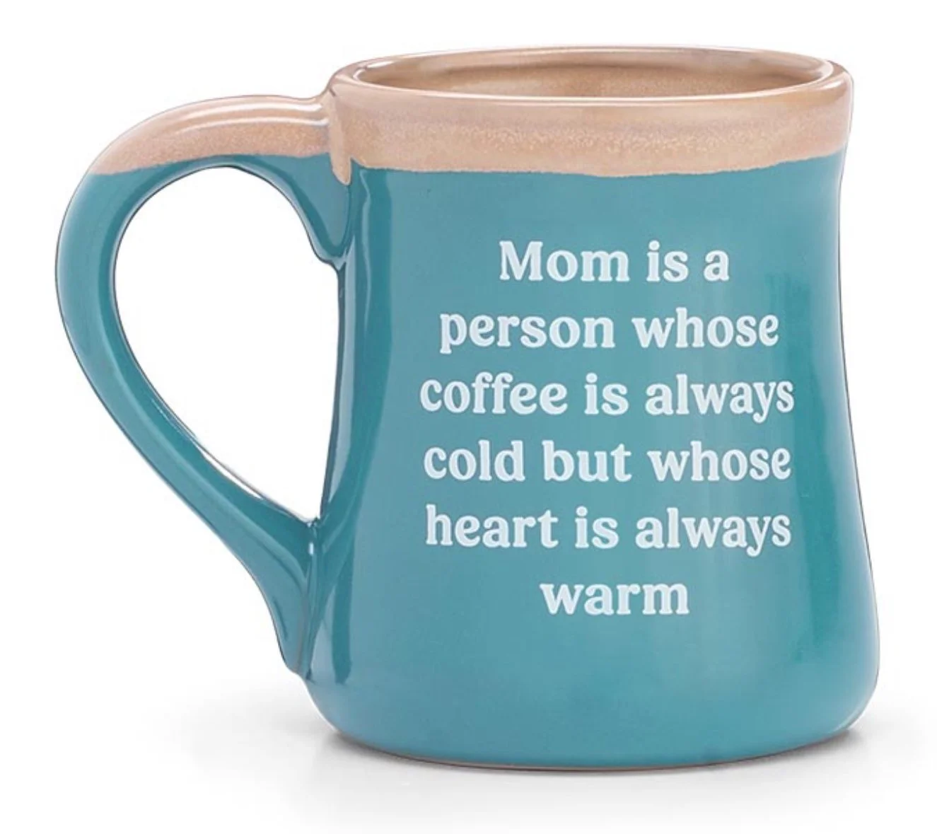 Mug with blue glazed background with a heart on front including a message reading: "Mom" and a message on back reading: "Mom is a Person Whose Coffee is Always Cold but Whose Heart is Always Warm".